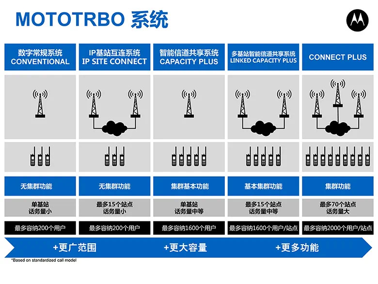 2.1以上版本的對講機,已經(jīng)被授權(quán)可使用摩托羅拉的集群系統(tǒng)(Capacity Plus-Single site和Capacity Plus-Multi-site)。摩托羅拉公司推出的集群系統(tǒng)擁有運行穩(wěn)定、自帶故障弱化,無專用控制信道(所有信道皆可用于語音業(yè)務(wù),提高系統(tǒng)整體性價比),解決了傳統(tǒng)對講系統(tǒng)的地域限制和容量限制問題。接入集群系統(tǒng)后對講機,將會擁有更多更強大的系統(tǒng)功能,更全面的幫您解決工作中遇到的問題。