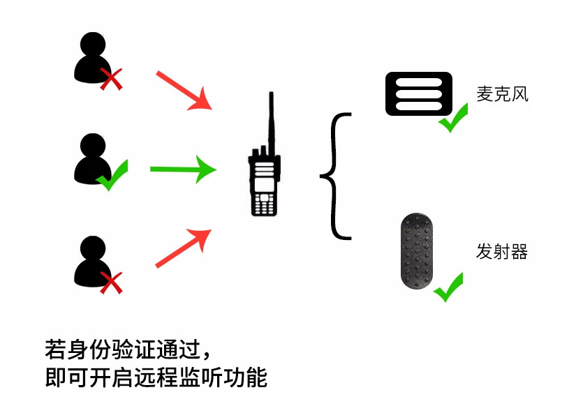 需要身份驗證的對講機遠程監(jiān)聽功能,允許用戶通過菜單向目標對講機發(fā)起遠程監(jiān)聽請求。請求成功后,目標對講機的麥克風(fēng)和發(fā)射器將被激活,以便遠程監(jiān)聽。