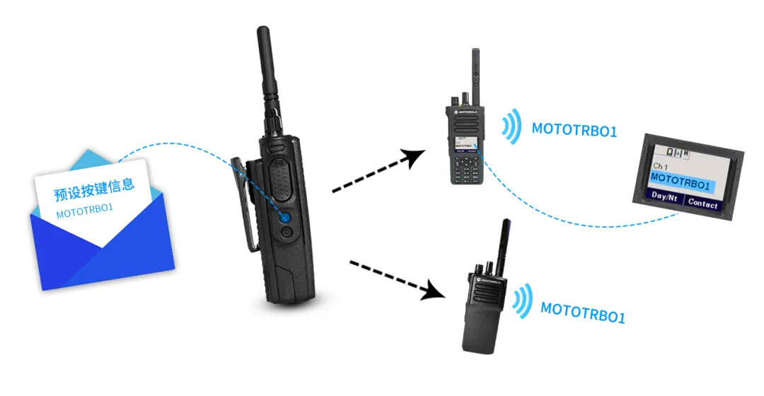 用戶可通過MOTOTRBO CPS編程軟件,提前輸入好常用的語音話術(shù),再將對應(yīng)的文本內(nèi)容設(shè)置到常用按鍵上(如:數(shù)字鍵或側(cè)鍵)。對于有顯屏的對講機,用戶還可以通過短信菜單來編輯、發(fā)送或查看短信。對于無顯屏或數(shù)字顯屏的對講機,用戶只能通過預(yù)設(shè)按鈕來發(fā)送預(yù)制短信。