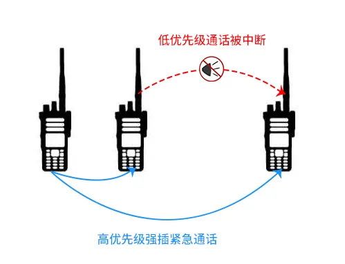 常規(guī)系統(tǒng)和集群系統(tǒng)均允許高等級權(quán)限用戶優(yōu)先進行呼叫。高等級用戶可以通過強插功能,中斷低優(yōu)先級用戶的呼叫。