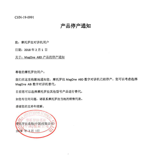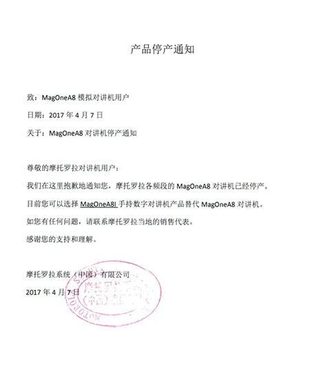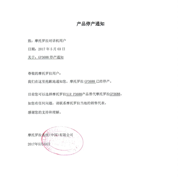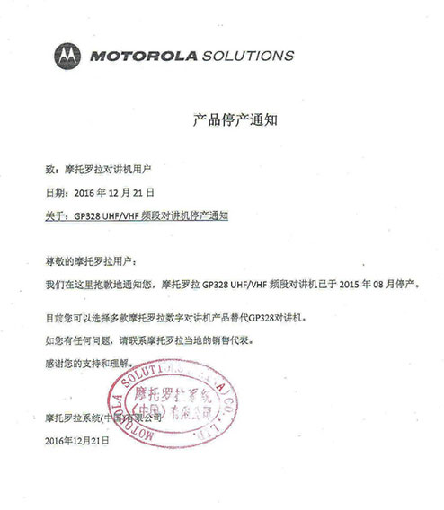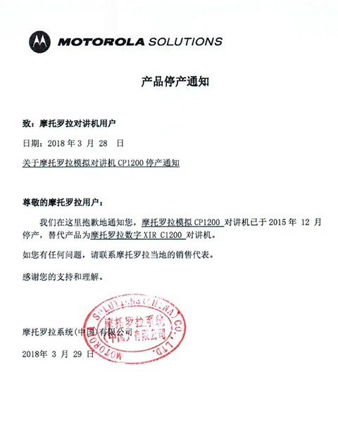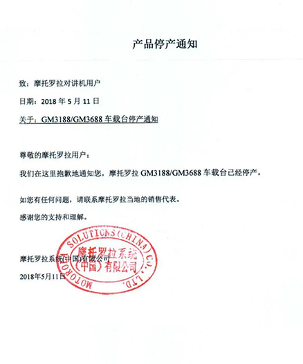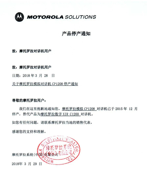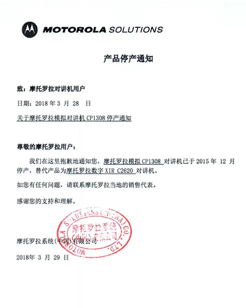 摩托羅拉系統(tǒng)根據(jù)國(guó)家相關(guān)要求,已于2015年逐步停止了模擬機(jī)全球工廠的生產(chǎn),同時(shí)按照國(guó)家有關(guān)規(guī)定,相關(guān)機(jī)型的《無線電發(fā)射設(shè)備型號(hào)核準(zhǔn)證》及《防爆電氣設(shè)備防爆合格證》均已不再辦理延期手續(xù)。